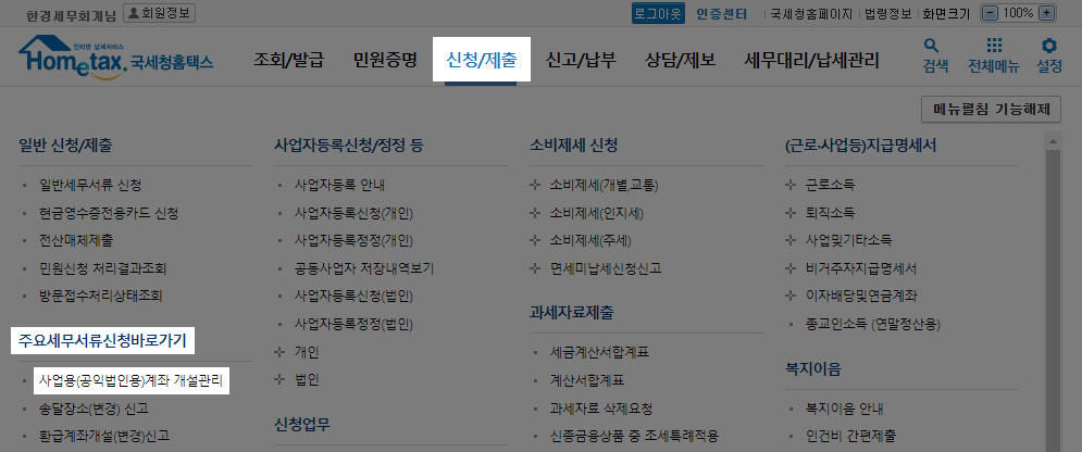 홈택스에서 등록할 때는 로그인 후 [신청/제출] - [주요세무서류신청바로가기] - [사업용(공익법인용)계좌 개설관리]를 눌러주세요.
