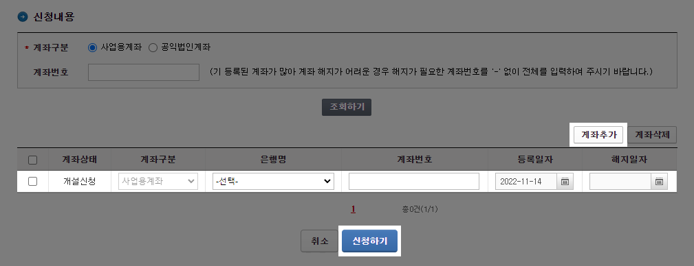 계좌를 새로 등록할 때는 [계좌추가]를 누르고 등록할 계좌 정보를 입력한 뒤 [신청하기]를 눌러주세요.