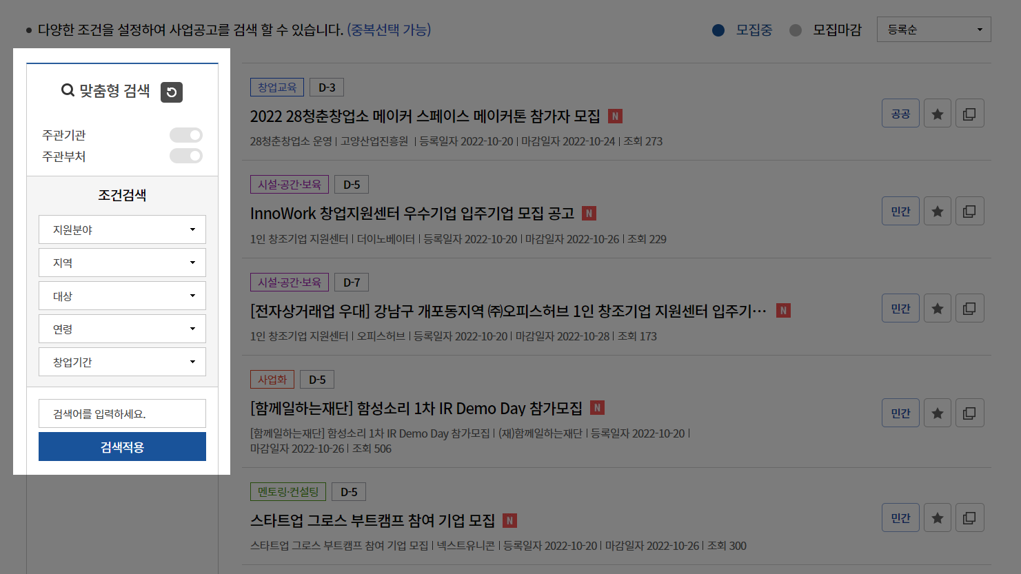 지원 분야, 지역, 대상, 연령, 창업 기간 등을 선택해서 상세 검색을 할 수 있어요 🙆🏻♀️