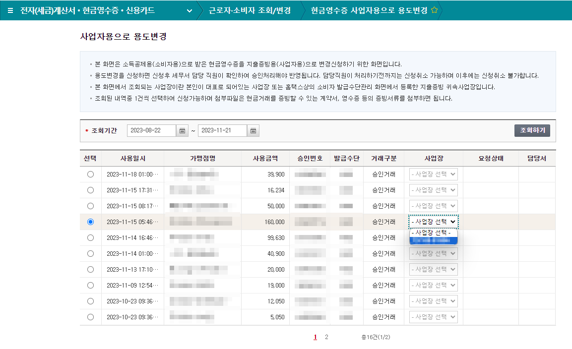 소득공제용으로 받은 현금영수증 중 지출증빙용으로 바꾸려는 내역을 선택하고, 사업장을 선택해주세요.