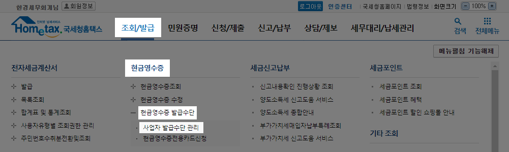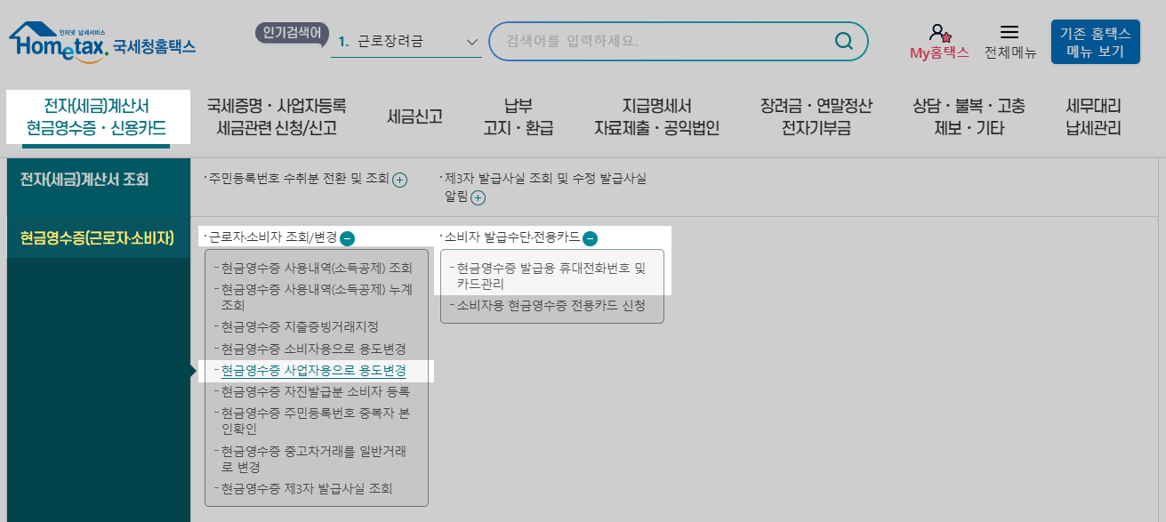 자동으로 변경되지 않은 내역이 있다면 [현금영수증] - [현금영수증 사업자용으로 용도변경] 메뉴를 이용해주세요.