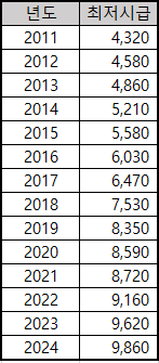 24년도 최저시급 : 9,860원 (23년도대비 2.5%인상)