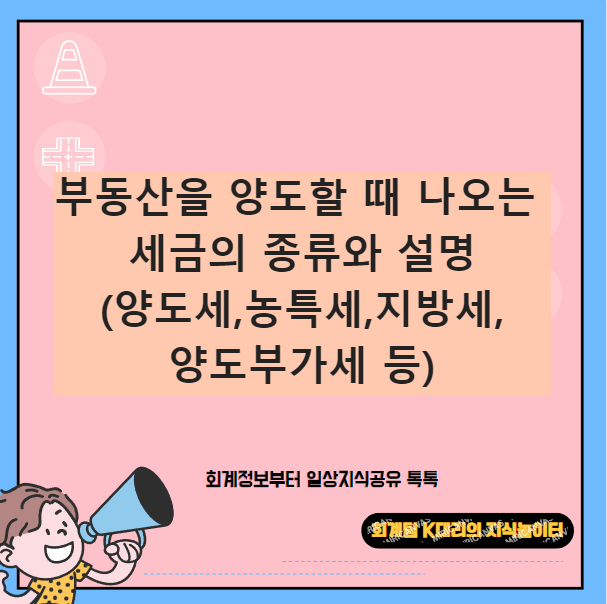 "안녕하세요! 이번 글에서는 부동산을 양도할 때 나오는 세금의 종류와 설명(양도세,농특세,지방세,양도부가세 등) 에 대해서 알려드리겠습니다"