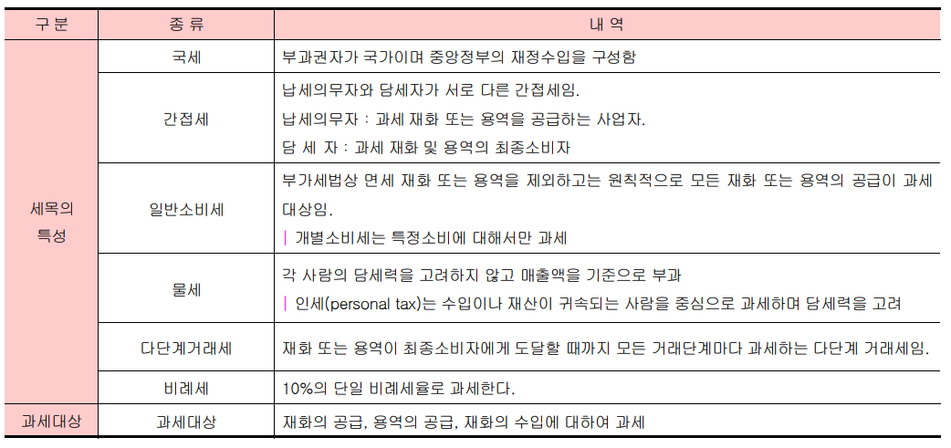 우리나라 부가가치세는 모든 재화 또는 용역에 대한 포괄적 과세를 시행하며, 간접세, 단일비례세의 특징을 가지고 있다.