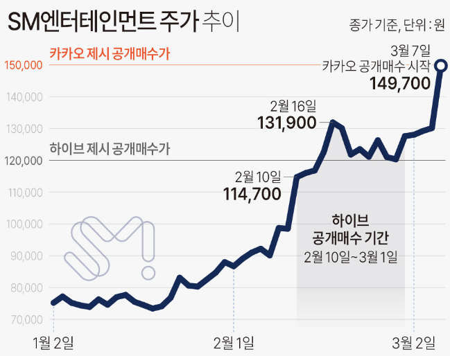 2023년 초 , 한 두달 사이 연예기획사 SM의 주가가 큰 폭으로 출렁였습니다. 경영권다툼이 벌어지면서 16만원까지 올랐다가 , 양측의 합의로 분쟁이 마무리되자 다시 11만원대로 마무리 되었습니다.