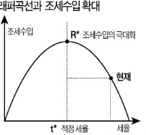 미국의 경제학자 래퍼(A. Laffer)가 제시한 조세수입과 세율 간의 관계를 나타낸 곡선 을 말한다. 래퍼는 세율이 0%에서 100%로 증가할 때 조세수입은 상승하다가 정점에 이른 후 다시 하강한다면서, 세율(t)을 수평축에 조세수입(T)을 수직축에 놓고 이들의 관계를 그려보면 아래 그림과 같이 “역 U자 모양의 곡선”이 된다고 주장하였다. 래퍼곡선 (Laffer curve)에 따르면 세율이 높아지면 초기에는 세수가 늘어나나 일정 수준(t*)이 넘으면 오히려 감소하므로 현재의 세율이 세수가 가장 많은 수준(t*)을 넘지 않았다면 세수증대를 위해서는 세율을 올려야 하며 반대로 현재의 세율이 세수가 가장 많은 수준을 넘었다면 감세가 세수증대에 도움이 된다.
