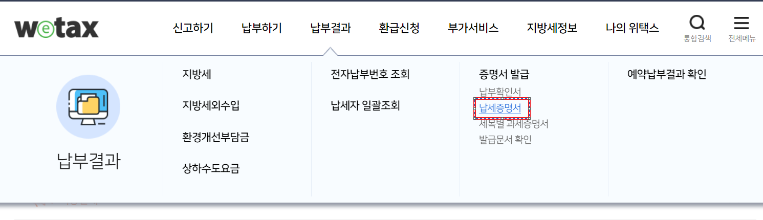 1) 위택스 납부결과 탭에서 -> 납세증명서 클릭