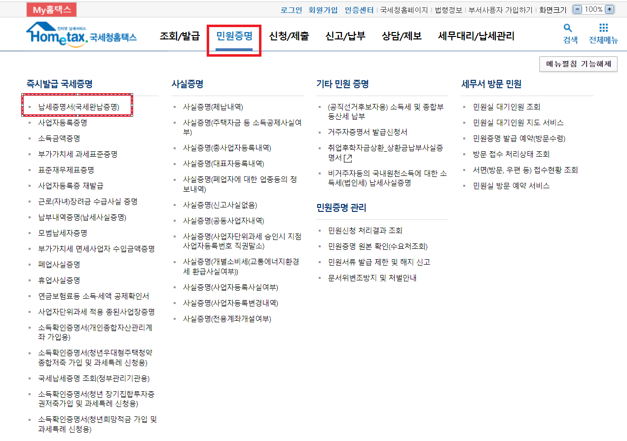 1) 홈택스 로그인에서 민원증명 탭 -> 납세증명서(국세완납증명서)
