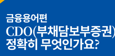 CDO(Collateralized Debt Obligation)란 회사채나 대출채권 등으로 구성된 pool을 기초자산으로 하여 AAA등급에서 equity(non-rated)까지의 다양한 신용등급으로 발행된 수 종의 선, 후순위 채권을 말하며 기초자산의 종류에 따라 회사채를 기초자산으로 하는 회사채 담보부증권(CBO; Collateralized Bond Obligation), 대출채권을 기초자산으 로 하는 대출채권 담보부증권(CLO; Collateralized Loan Obligation)으로 분류된다. 그리 고 발행목적에 따라 주로 은행 등의 금융기관이 대차대조표 상에서 위험자산을 제거하기 위하여 발행하는 Balance Sheet CDO와 고수익의 원자산인 대출금, 회사채 등과 선, 후순위 채권간의 이자차익을 얻기 위해 발행하는 Arbitrage CDO 등이 있다.