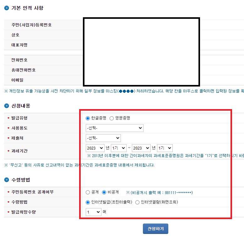 2. 사용용도 및 매수 클릭 (과세기간도 잘 체크할것 ! , 보통 몇개년치 달라고 하는 경우도 많다)