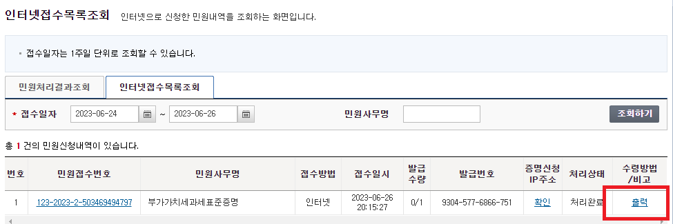 3. 인터넷 민원접수목록에서 출력 탭 클릭