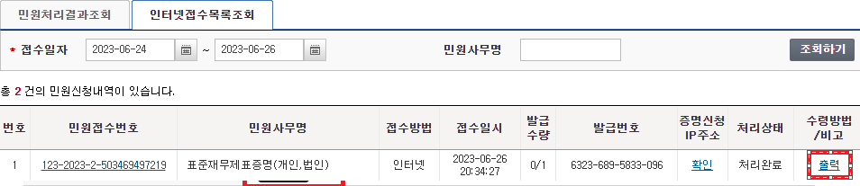 3. 인터넷 민원접수목록에서 출력 탭 클릭