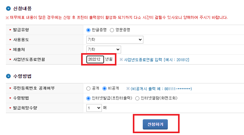 2. 사용용도 및 매수 클릭 (사업년도종료월 잘 체크할것 ! , 1년단위로 지정이다/ 보통 3개년치를 달라고 하는 경우도 많다)