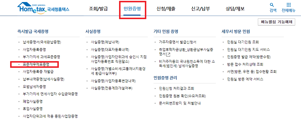 - 홈택스 로그인 후 민원증명 탭 - 표준재무제표증명 클릭