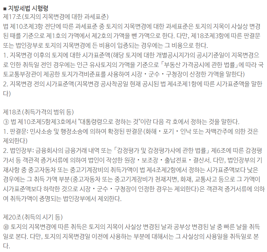 - 법인 : 법인의 장부가액을 기준으로 하며 토지의 지목변경에 소요된 비용이 과세표준
