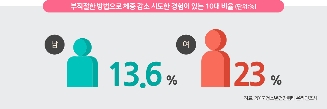 교육부 ‘2017 청소년 건강행태 온라인 조사’에 따르면, 체질량지수 85% 미만인 마른 여자청소년 3명 중 1명이 자신을 ‘살 찐 편’이라고 생각하는 것으로 나타났다. 특히 여학생 23%는 한 가지 음식만 먹는 다이어트 등 부적절한 방법으로 체중 감소를 시도한 적이 있다고 답했다.