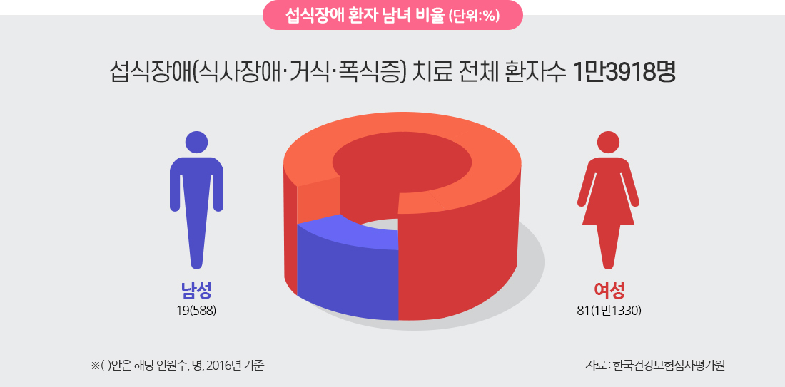섭식장애 환자 10명 중 8명은 ‘여성’체형이나 체중에 대한 심한 집착으로 음식 섭취를 거부하거나(거식증) 많은 음식을 섭취하고 구토를 반복하는(폭식증) 것을 섭식장애라 한다. 섭식장애는 젊은 여성에게 특히 많은데 마른 몸매를 아름다움의 기준으로 삼는 사회 분위기 속에서 환자가 점점 늘고 있다.