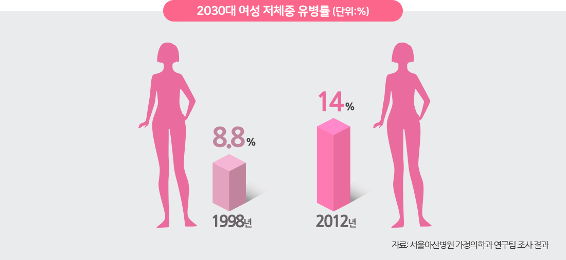 저체중 여성도 늘었다외모는 곧 능력이고, 마른 몸매가 곧 아름다움이라 여기는 사회 분위기 속에서 저체중인 젊은 여성이 꾸준히 증가하는 등 건강이 심각하게 위협받고 있다. 실제로 서울아산병원 가정의학과 연구팀이 조사한 결과를 보면, 1998년 8.8%였던 20~30대 여성 저체중 환자가 2012년 14%로 늘어난 것을 알 수 있다.
