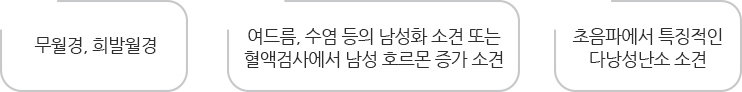 등의 다양한 증상으로 내원을 합니다. 이런 환자들에서 콧수염, 얼굴과 등의 심한 여드름, 남성형 탈모 등이 동반되는 경우도 많이 관찰됩니다.